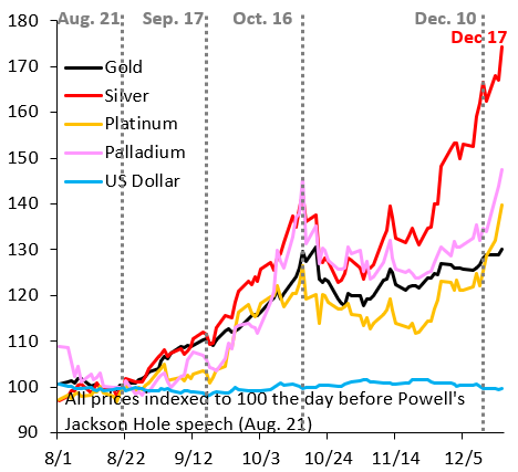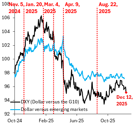 Ainda em dezembro, o dólar voltou a cair em relação aos mercados emergentes, após o terceiro corte de juros do Fed. Isso chama a atenção para um novo risco: a interferência política no Fed e como o mercado irá responder, por exemplo, exigindo prêmio de risco maior para o dólar.