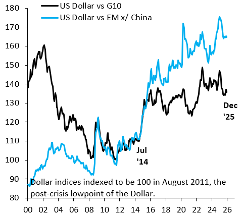 Apesar das oscilações recentes, o dólar continua estruturalmente forte quando analisado no longo prazo. Desde meados de 2014, a moeda americana se valorizou cerca de 23% frente às moedas do G10 e aproximadamente 50% contra as moedas de mercados emergentes. Isso mostra que, mesmo após correções pontuais, o dólar segue em um patamar historicamente elevado.